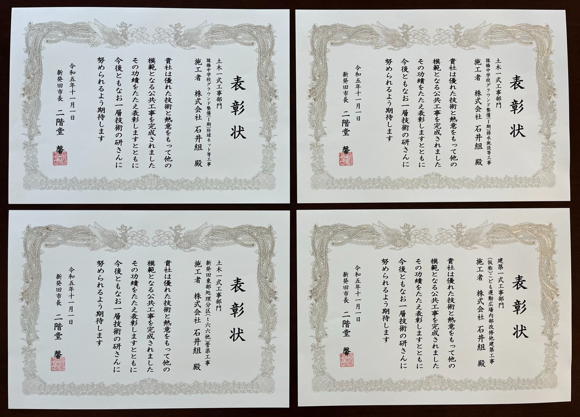 2023年11月01日(水) 表彰されました 猿橋中学校グラウンド整備排水施設等工事・防球ネット等工事 新発田東部処理分区管渠工事 (仮称)こども運動広場内部改修他建築工事 の4件につき、優良工事として新発田市から表彰いただきました。 これを励みに、これまで以上に技術の向上に努め、引き続き新発田のまちづくりに貢献して参ります。
