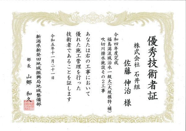 2023年11月21日(火) 優良工事表彰式 新潟県より優良工事に認められ、表彰式がありました。 令和4年度施工 福島潟流域治水一級大(大規模・補)吹切川排水施設その2工事 ☆優良工事証:株式会社石井組 ☆優良技術者証:佐藤伸治さん 工事に携わってくださった皆さんの努力の賜物だと思っています。 日頃からのご協力に心から感謝いたします。 これからも安全第一でお願いいたします!