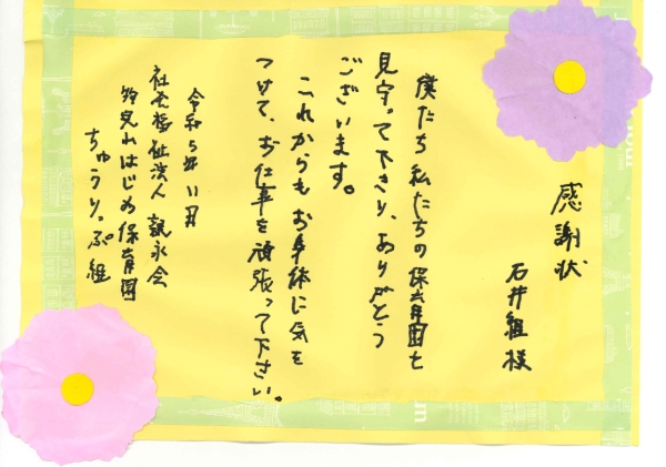 2023年11月15日(水) 子どもたちから感謝状をいただきました 2020年に建て替え新築工事を担当させていただいた、物見山はじめ保育園ちゅうりっぷ組のみなさんから、手書きの感謝状をいただきました。 お引渡から3年半以上が過ぎましたが、お子さんたちに石井組が保育園を建てたことを伝え続けてくださっているそうです。 がんばって書いてくださってありがとうございます! あたたかくて安全な園舎で、園児の皆さんが楽しく健やかに過ごせますよう、私たちもいつも願っています。
