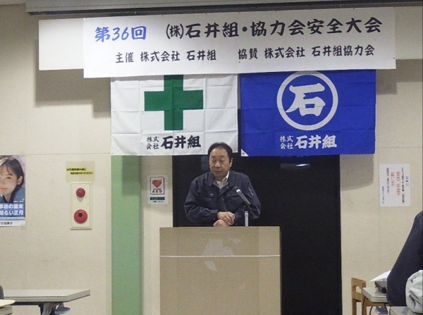 2024年12月24日(火) 令和6年度 石井組・協力会安全大会を開催しました 12月19日、健康長寿アクティブ交流センターあおり館にて、協力会の皆さんにも参加していただいて令和6年度の安全大会を開催しました。 当社では『人命は、なにものにも代え難し!』『健康は、なにものにも代え難し!』を合言葉に、無事故・無災害を年間スローガンに掲げ、健康でゆとりのある豊かな生活形成と、明るく快適な職場環境の形成を目指して努力しています。