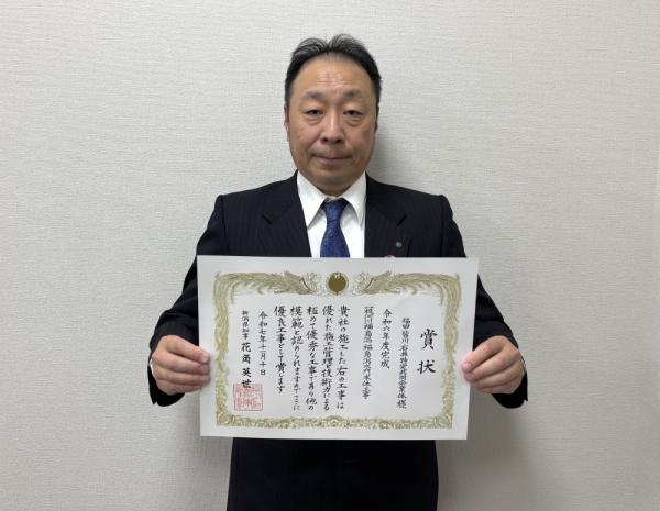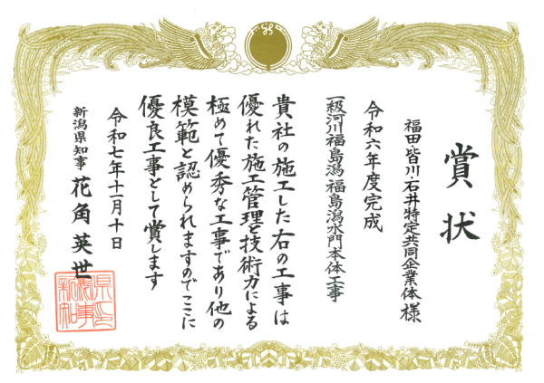 2025年11月10日(月) 令和7年度優良工事表彰式 新潟県より、令和6年度に完成した2,000件以上の工事の中から特に優良な工事と認められ、表彰されました。 令和6年度完成 一級河川福島潟福島潟水門本体工事 福田・皆川・石井特定共同企業体 これもひとえに、工事に携わってくださったすべての皆様の日々の努力の賜物だと思っております。 日頃からのご協力に心から感謝いたします。 これからも安全第一でお願いいたします。