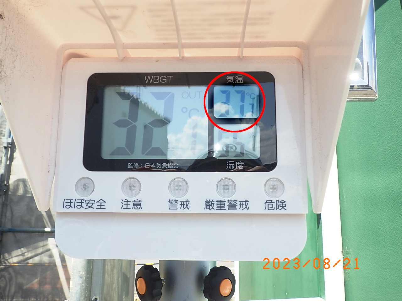 2023年08月21日(月) 熱中症にご注意ください! ミッドタウン小舟の西松屋様店舗新築工事の現場では、猛暑日が続く中、9月末の竣工に向けて作業が進められています。 8月21日(月)10時の現場の気温は37.7℃!!(見えにくくてすみません) 現場の皆さん、こまめな休憩と水分補給で体調を崩さないようにもうひと踏ん張り、頑張ってください。